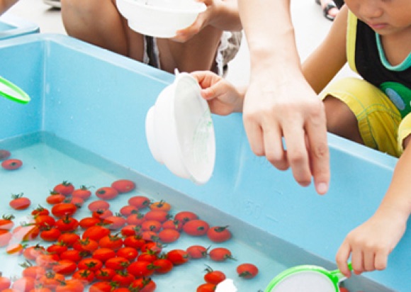 お祭りの露店でみかける金魚すくいやスーパーボウルすくいの要領で、水槽にぷかぷか浮かぶいろんなプチトマトの種類を学びながらすくうゲーム。300円ですくっただけ何個でも、1個もすくえなくても3個もらえるので、子どもたちが気軽にチャレンジしていました。