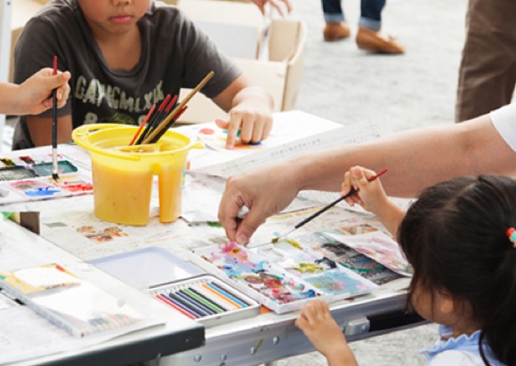 「ここを東北復興支援の窓口にしたい!」とブースを出店するのは、社団法人「brave action」。石巻のかにみそや気仙沼のおつまみこんぶなどの物産販売の脇で、「家族や地域など、横のつながりを大切に」という思いをこめ、絵てがみワークショップを無料で開催。「描くこと」を通して、さまざまな人たちの交流にひと役買っていました。