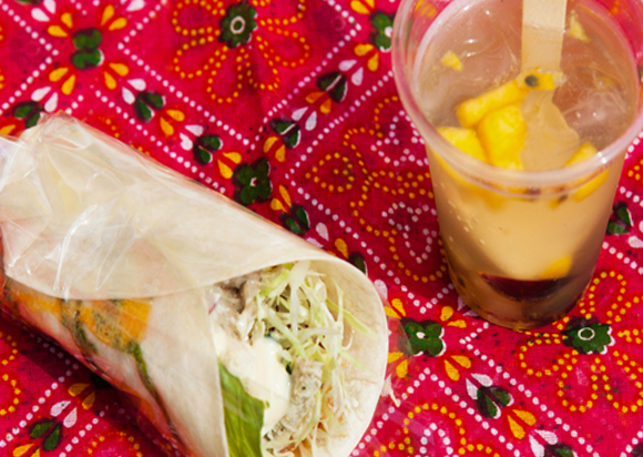 【Pick up】キャベツ、レタス、レッドオニオンとハーブチキンをとうもろこしから作るパンで包んだチキントルティーヤは、食べやすさが◎。フルーツサングリアとのセットで1000円。