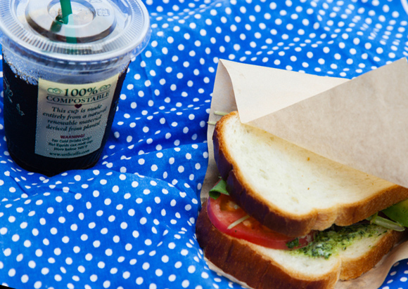 【Pick up】味はしっかり、でも後味はすっきり。コーヒー好きならずともやみつきになることうけあい!のアイスコーヒー(写真はLサイズで500円、レギュラーサイズ(450円)もあり)と、エアルームトマトを使ったサンドイッチ650円。