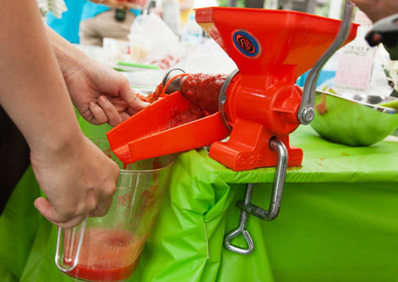 イタリアの天才トマトブリーダー(育種家)マウロさんらが日本人向けに開発したオリジナルブランドの品種「シシリアンルージュ」。この味の違いをより知るため、ジュースにするトマトつぶしのワークショップを開催。当日は、トマトのあまりの人気に一時実施が困難になるハプニングも!