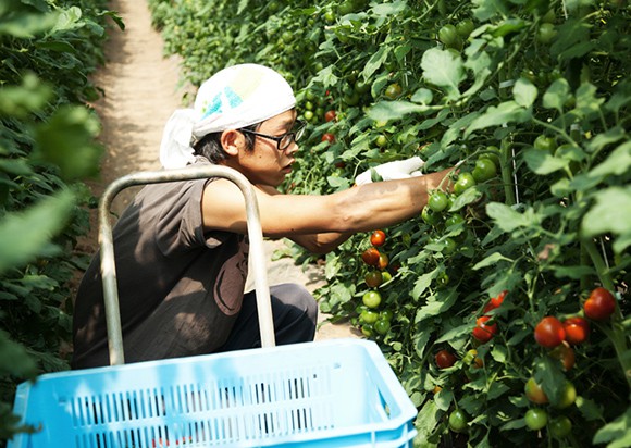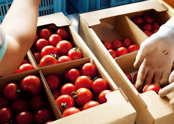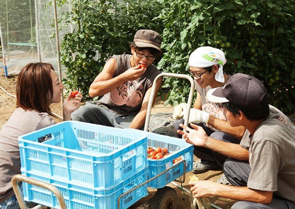 続いて向かったのは収穫の現場。若干 27歳!の大前章さんをはじめ、スタッフはみんな若く、場は笑いと活気に満ちあふれています。「実は寒暖の差が強いほど、甘いトマトができるんです」と大前さん。「トマトは積算温度で赤みを増していくん ですけど、暑すぎると急に大きくなりすぎてしまうので、寒い時もあったほうが、ゆっくりと赤みを増しながら糖度が出るので、おいしくなるんです」。また2歳のお子さんを持つ大前さんは、トマトを親子関係になぞらえます。「トマトは体(木)を作りながら、実をつけていく植物。大きくてしっかりした親がたくさんの子どもを養えるように、トマトもしっかりした木には実がたくさんなる。だから夏の時期は、水をたくさんあげてまずは木を成長させます。でもあげすぎると今度は実(トマト)の方の味がぼやけてしまう。そのバランスが大切なんです」大前さんいわく、赤いトマトを採ることは、子どもが自立していくような感覚だといいます。