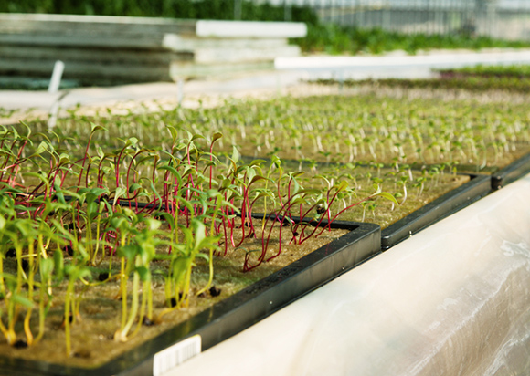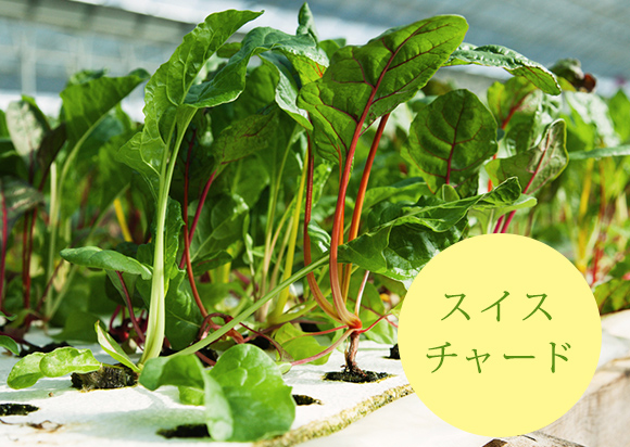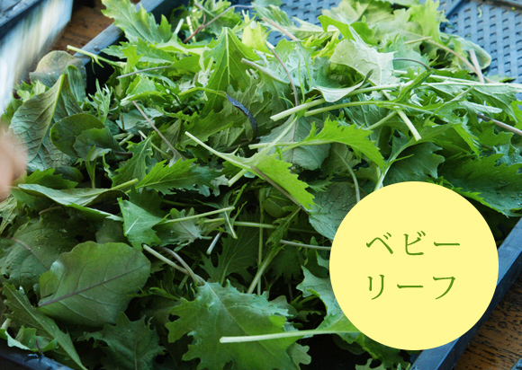 ここで力を入れて育てている野菜は、レストランでしか食べたことのないような、海外の珍しい品種。たとえば、イタリアのほうれん草に似た野菜、スイスチャード。「最初すっごい甘みが強くて、最後に苦味がちょっとくる。レストランのシェフに言わせると、この苦味がニンニクを使った料理と合うらしいです。あと普通でしたら筋ばっていて生食は無理なんですけど、うちのは柔らかいんで、生でも食べていただけます」他には、リーフチコリは柔らかくて苦味が強く、サラダにぴったり。さらにベビーリーフはシャキシャキッと食感が立体的でみずみずしい。水分を長く保つため、時間が経ってもしなりにくいのが特長です。