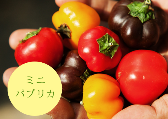 また喜多さんのいちおしは、ピートモスの培地で育てるミニパプリカ。「木になったまま完熟させるので、甘みが普通のパプリカよりも倍じゃ効かないくらいの甘さなんです。ピクルスにしてもいいですし、炒め物にまるごと入れていただいても見た目にかわいいと思います」